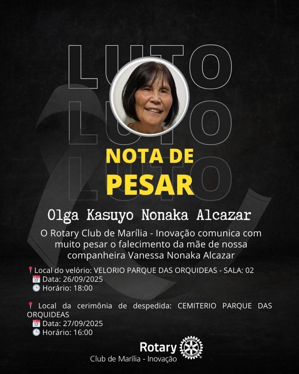 É com profundo pesar que o Rotary Club de Marília Inovação comunica o falecimento da senhora Olga Kasuyo Nonaka Alcazar, mãe da nossa estimada companheira Vanessa Nonaka.
